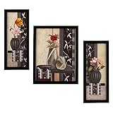 The Indianara Floral Wood Art Painting is a set of 3 rectangular and square paintings of flower vases in different asymmetrical settings.